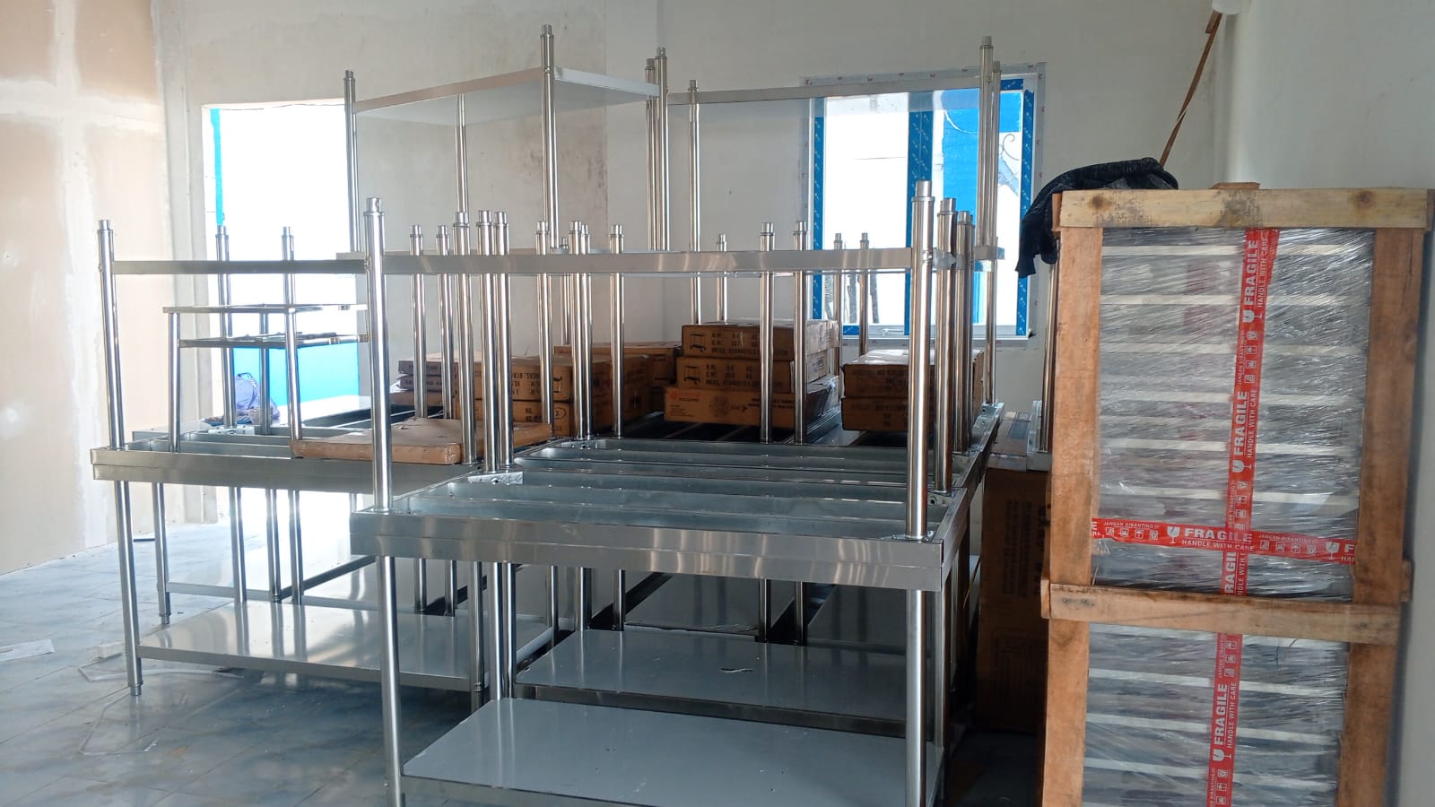 Menyediakan meja dapur stainless, rak, trolley, dan sink khusus untuk dapur produksi makanan bergizi.