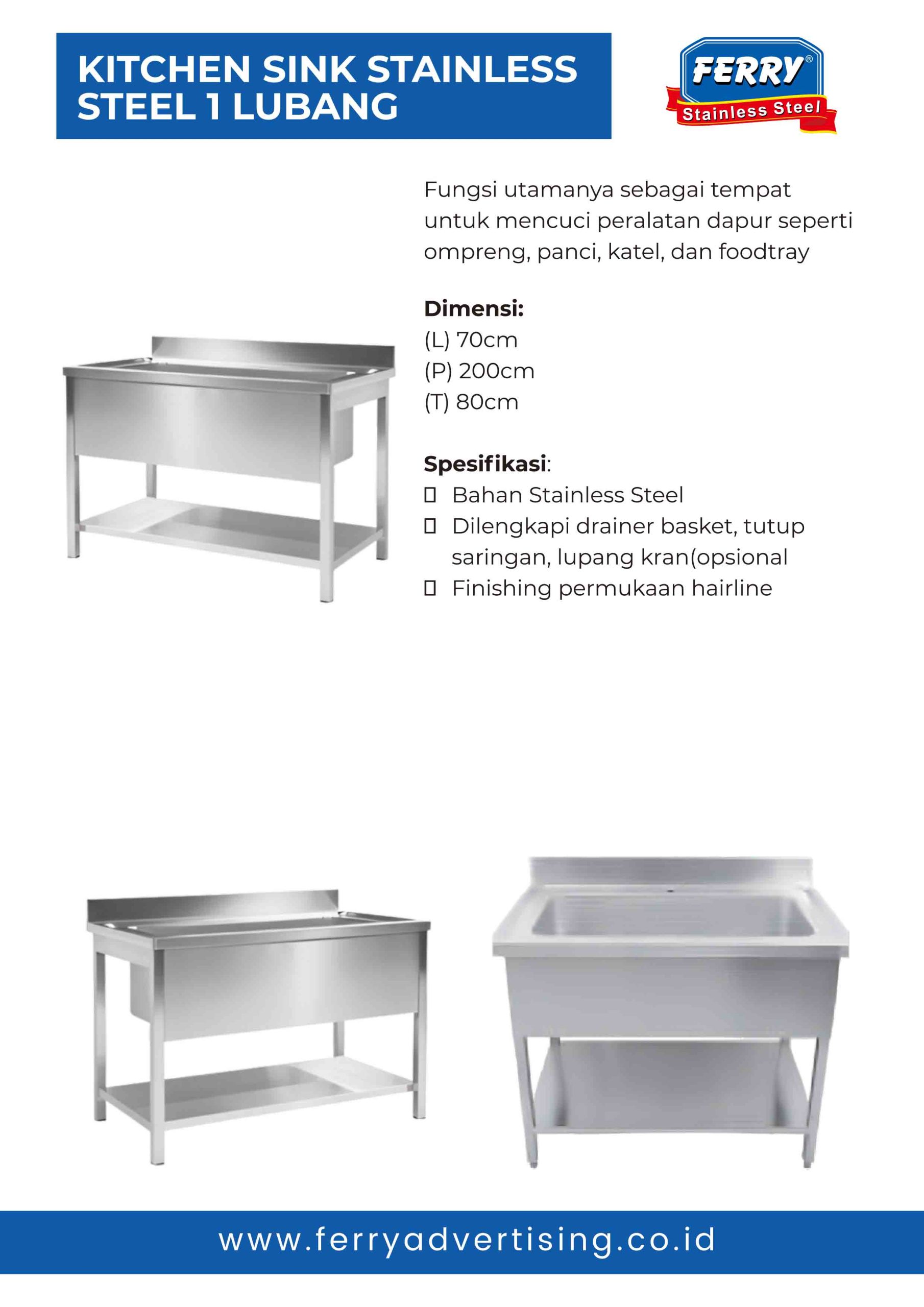 Selain meja dan rak, kami juga menjual perlengkapan dapur stainless lain untuk menunjang dapur higienis dan efisien, seperti: