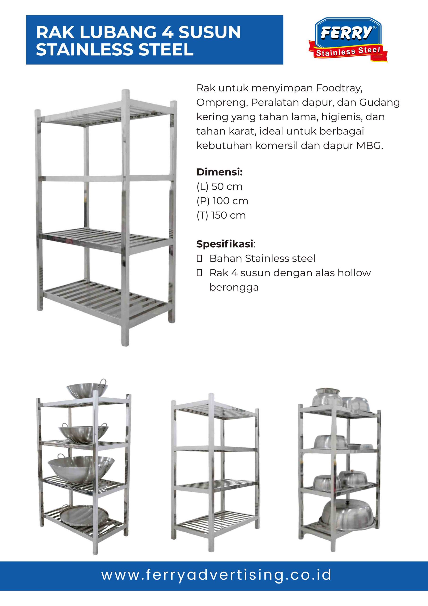 Permukaan datar dan kuat, ideal untuk penyimpanan bahan makanan, peralatan dapur, dan ompreng di dapur Makan Bergizi Gratis.Rak Sepatu Stainless