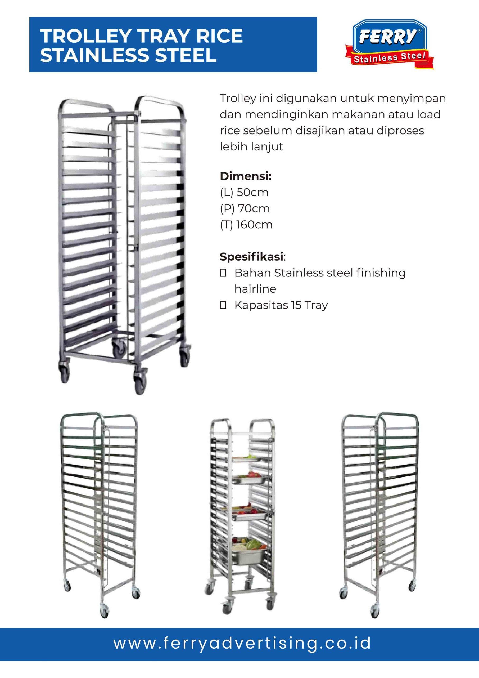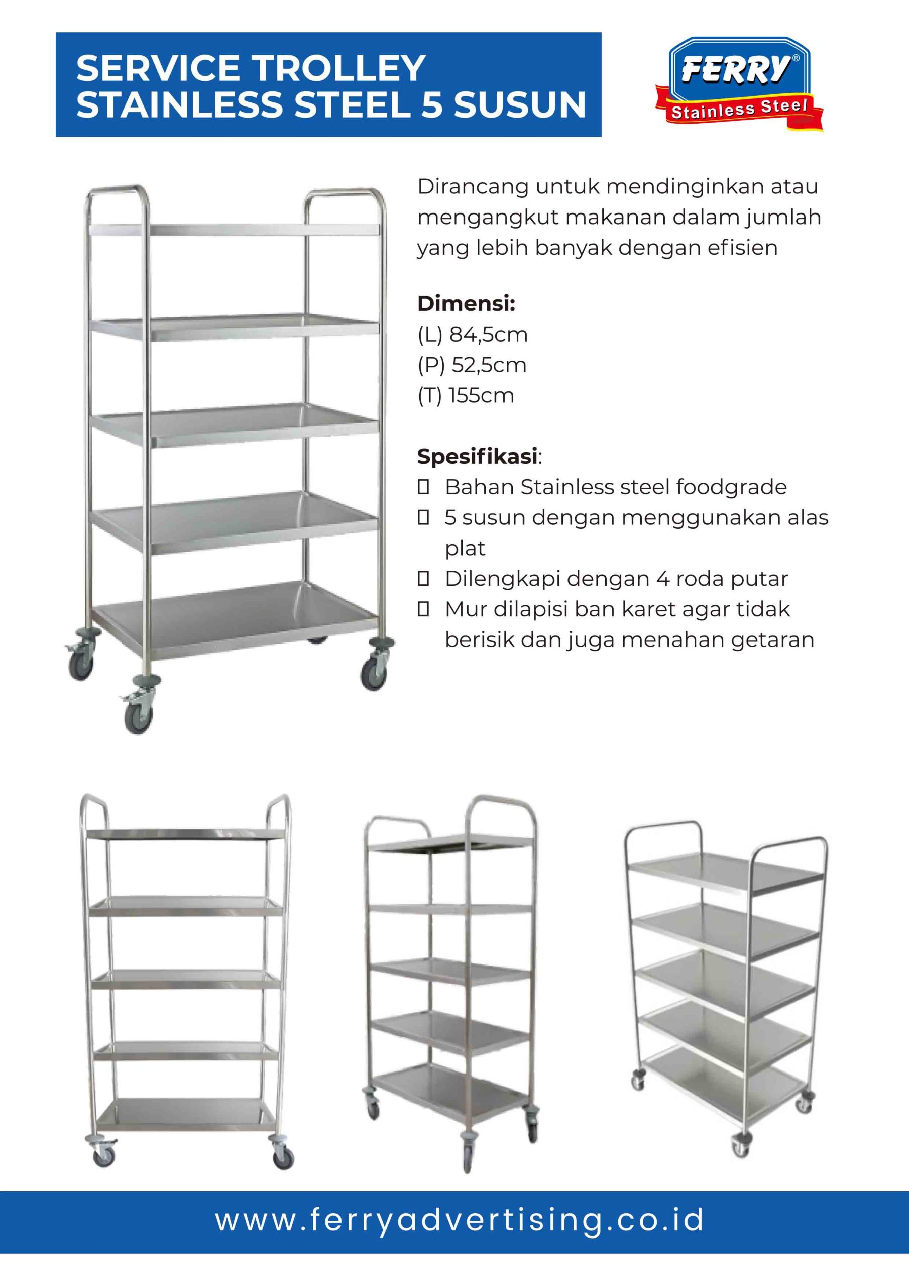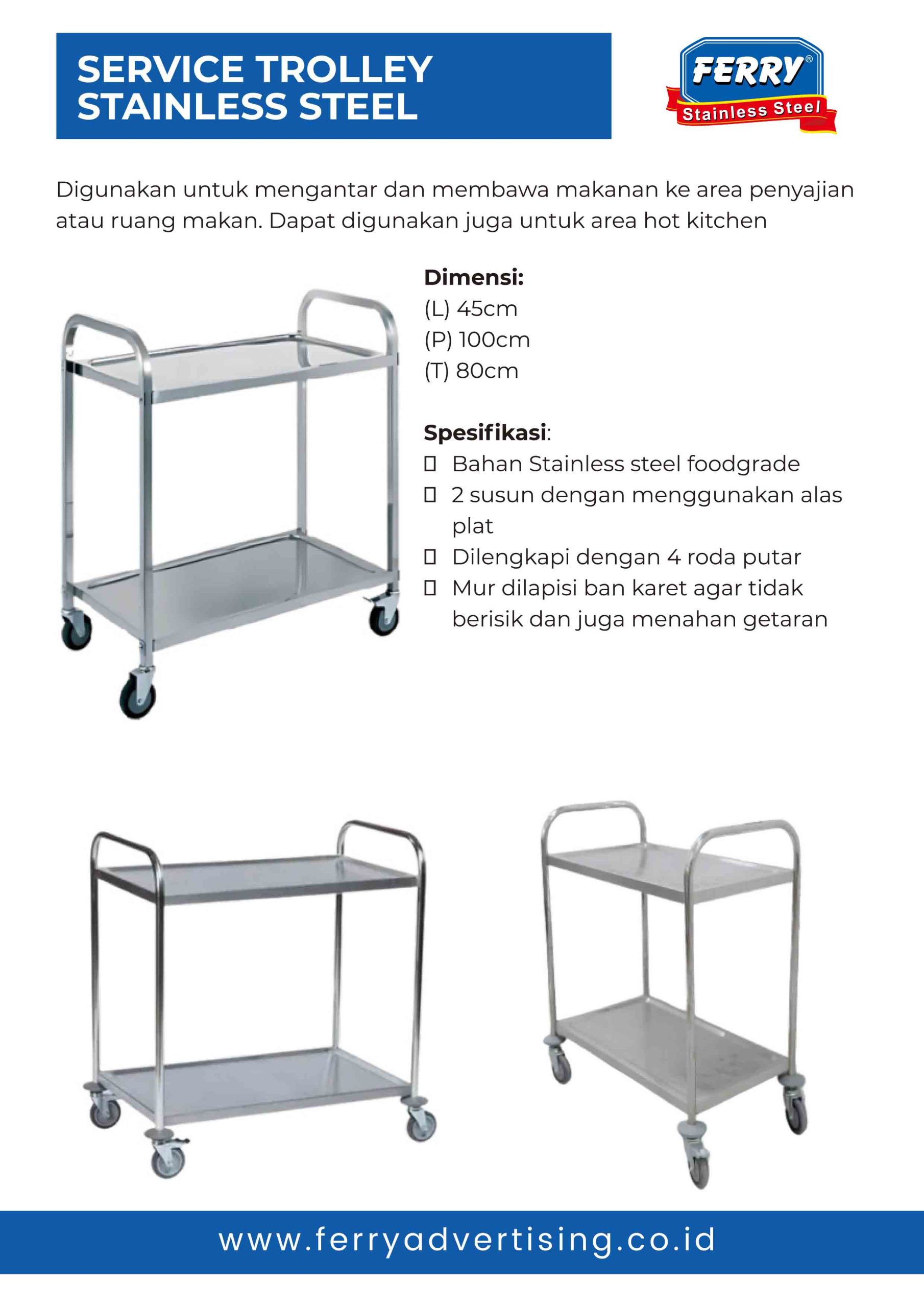 Service Trolley Stainless & Service Trolley 5 Susun Stainless – ideal untuk pelayanan makanan di sekolah dan rumah sakit.